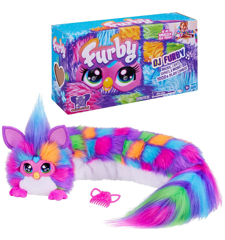 Furby DJ Furby Rainbow Electronic Plush Toy for Girls & Boys 6+ . DJ Furby brings the party with music, games, lights, jokes, and so much more. With 5 modes and over 1000 possible play combinations to create, kids decide the vibe with this incredibly interactive plush toy. There's so much to do, like play solo and multiplayer games, chill with yoga moves and cool light shows, listen to catchy songs in both English and Furbish (the official Furby language), and more. To start, press the heart gem, lay them on their back, and lift the head, almost like a space otter! DJ Furby is not your average electronic pet or cute stuffed animal - they're an amazing best friend that makes a great gift for girls and boys 6 years and up. Includes DJ Furby toy and comb. Figure scale: 32 inches (81 cm) Ages 6 years and up Requires 4 AA batteries (not included) WARNING: Small parts may be generated. Interactive toy does not connect to the internet. Surface clean only. © 2024 Hasbro. All rights reserved.